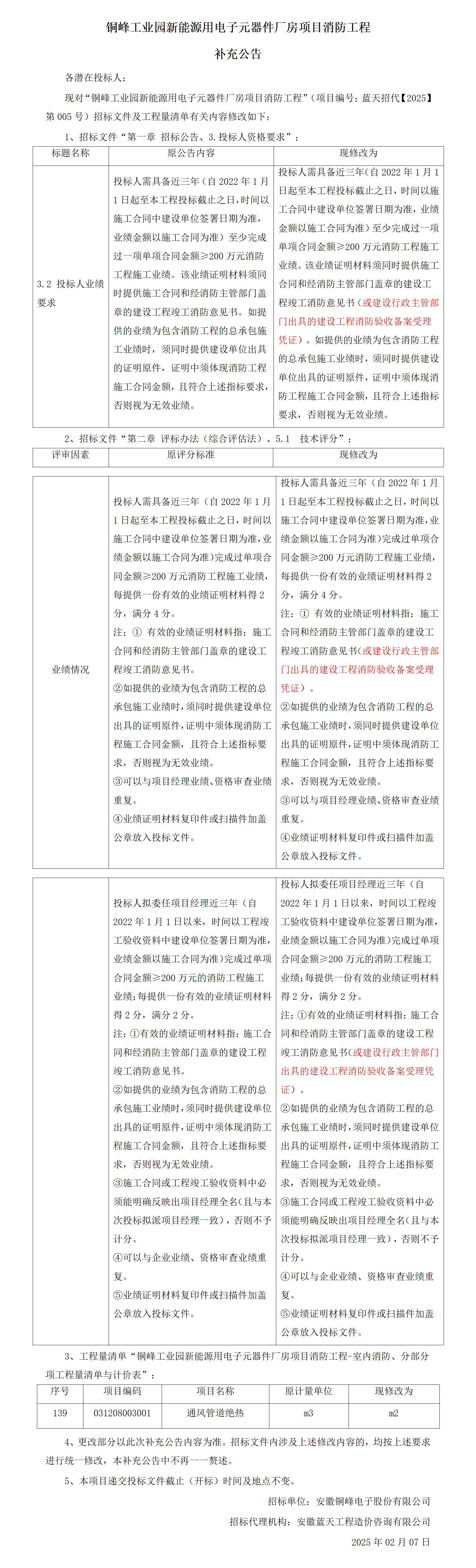 銅峰工業(yè)園新能源用電子元器件廠房項目消防工程補充公告