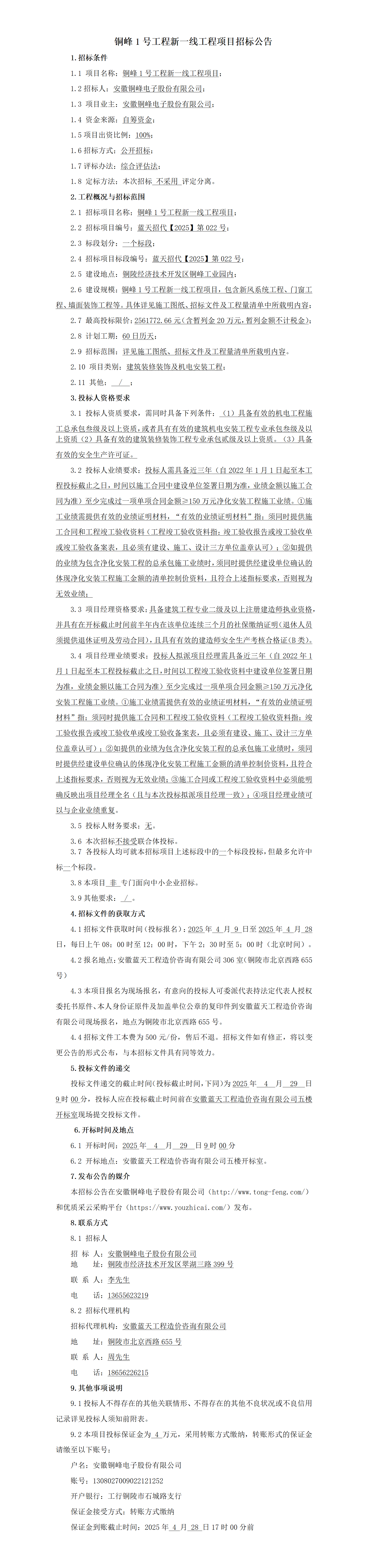 銅峰1號(hào)工程新一線工程項(xiàng)目招標(biāo)公告