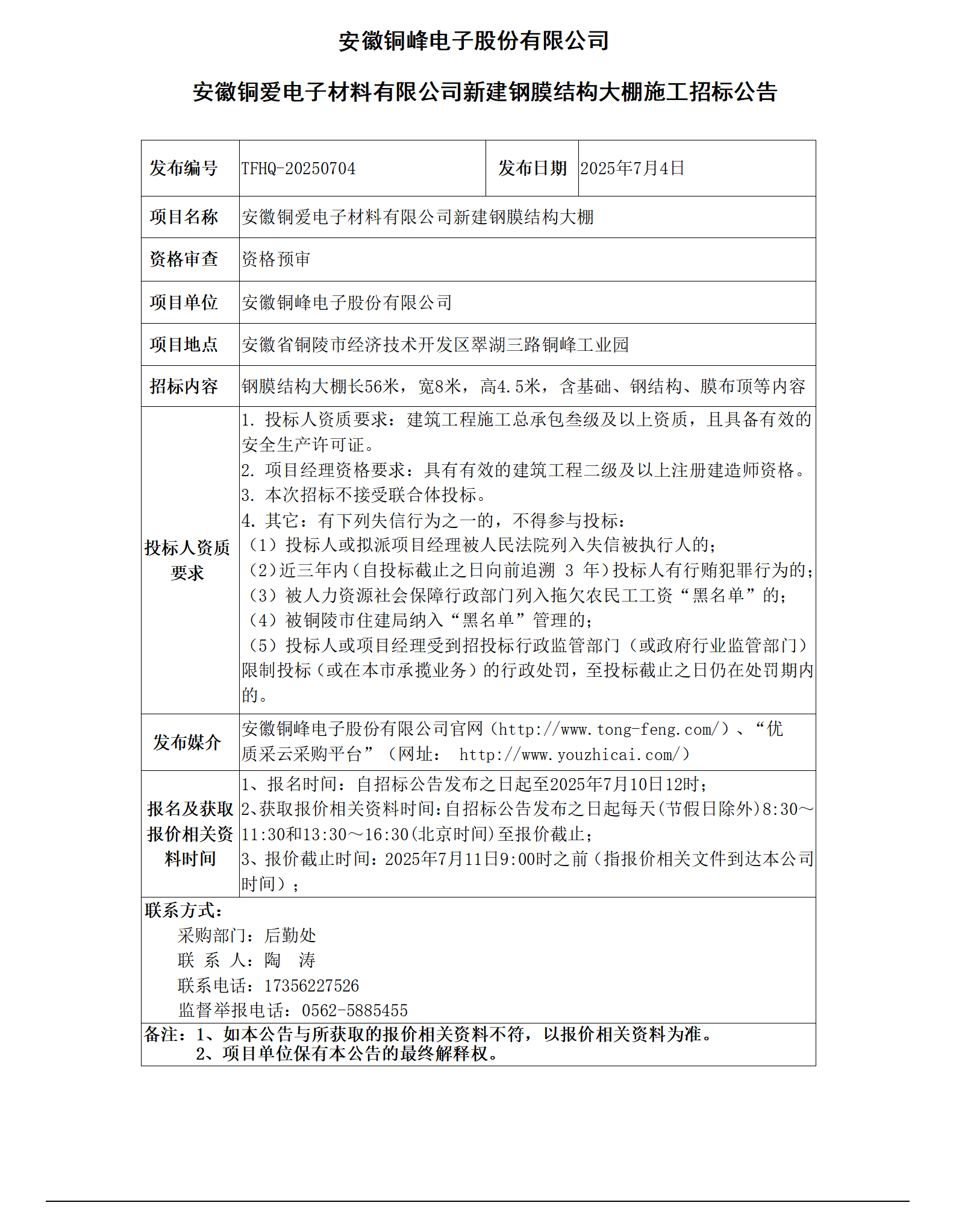 安徽銅峰電子股份有限公司 (安徽銅愛電子材料有限公司新建鋼膜結(jié)構(gòu)大棚招標(biāo)公告)_01