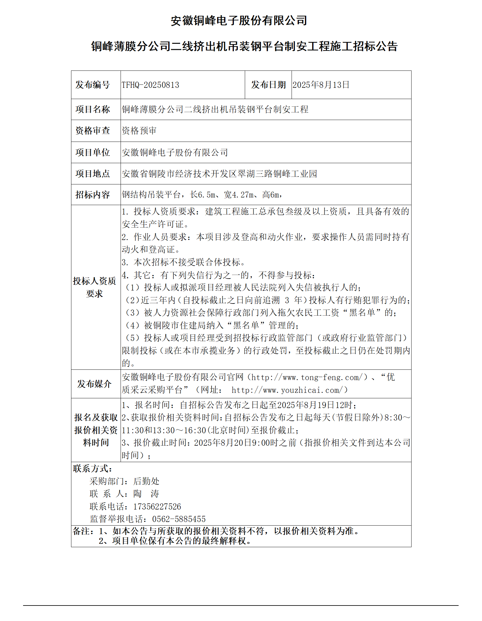 安徽銅峰電子股份有限公司 (銅峰薄膜分公司二線擠出機(jī)吊裝鋼平臺制安工程招標(biāo)公告)_01